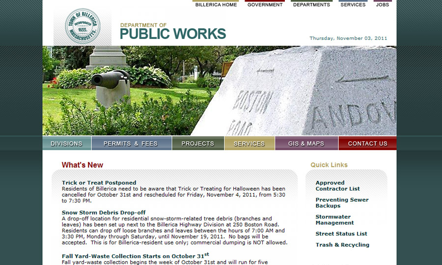 Website design & development for Billerica, Mass. Dept. of Public Works.